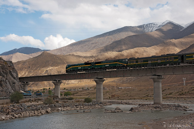 Lhasa-Bahn auf der Brücke über den Fluss TOELUNG CHA, kurz vor Lhasa