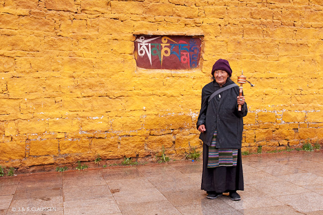 Pilgerin auf dem Lingkhor, vor dem oft rezitierten Mantra: "OM Mani Padme Hum".