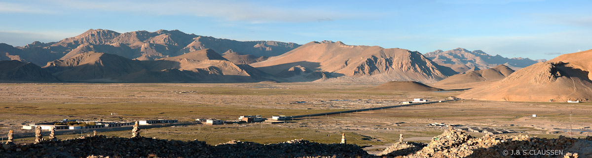 Panorama mit unserer Unterkunft bei "Old Tingri" (4300m), dem "Snow Leopard Guesthouse" am "Friendship Highway", der in linker Richtung nach Nepal führt